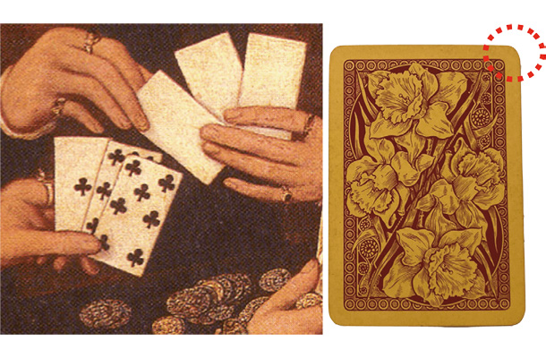 上流階級の賭け事の対象にスポーツがありましたが、この階級にとってはフェアプレイ精神が何よりも大切。トランプも同じで、19世紀を通じてさまざまな工夫が施されました。まず、絵札の確認でカードを逆さにする必要がなくなるよう、絵札に描かれた単身像を上下対称の半身像に変えました。次にカードの裏地の汚れや擦れた四つ角で判別されないよう裏地のデザインを複雑化し、四隅の角も丸くしました。さらに扇のように広げてもカードを即座に識別できるように左上端と右下端にスートと印字を加えました。