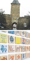 駅から西へ延びる通りに沿って歩くと、ヴェルター・トーア(Werther Tor)という門が見え、そこをくぐると、まるで絵から飛び出したような木組みの建物が出迎えてくれます。町の中心部は車道から離れた静かな環境にあり、メーン通りに沿って澄んだ川が流れています。こじんまりとしたお店が軒を連ねるこの通りで、まず目にとまったのが手作りタイルのお店。店内を埋め尽くす無数のタイルはすべて、近郊の町オイスキルヒェンの工場で焼かれたもので、1つひとつに手描きの絵が施されています。かわいらしい卵の絵が描かれたタイル(3ユーロ)を、おみやげに1つ買ってみました。