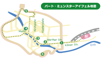 ドイツ西部に位置するアイフェル地方は、北はアーヘン、南はトリアー、東はコブレンツにまたがる広大な中級山岳地帯。その中に、デュッセルドルフから電車で約2時間ほどで行ける「バート・ミュンスターアイフェル」という町があります。ここは、4つの塔と城壁に囲まれた中世の面影を残す小さな田舎町。古くはウール製の布製品の製造や鉛の鋳造などで栄え、現在はクナイプ療法を取り入れた温泉保養地として知られています。