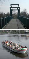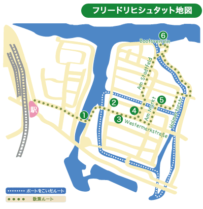 駅からまっすぐに伸びる遊歩道を行くと、目の前に青い橋(Blaue Brüch)が見えてきます。トレーネ川に架かるこの橋を渡っている途中、遊覧船がちょうど真下を通り掛かったので、こちらが手を振ると、たくさんの乗船客が手を振り返してくれました。また、足こぎボートやカヌーを楽しむ人たちも次から次へと川面に現れ、私も早く乗ってみたいとそわそわした気分になりました!
